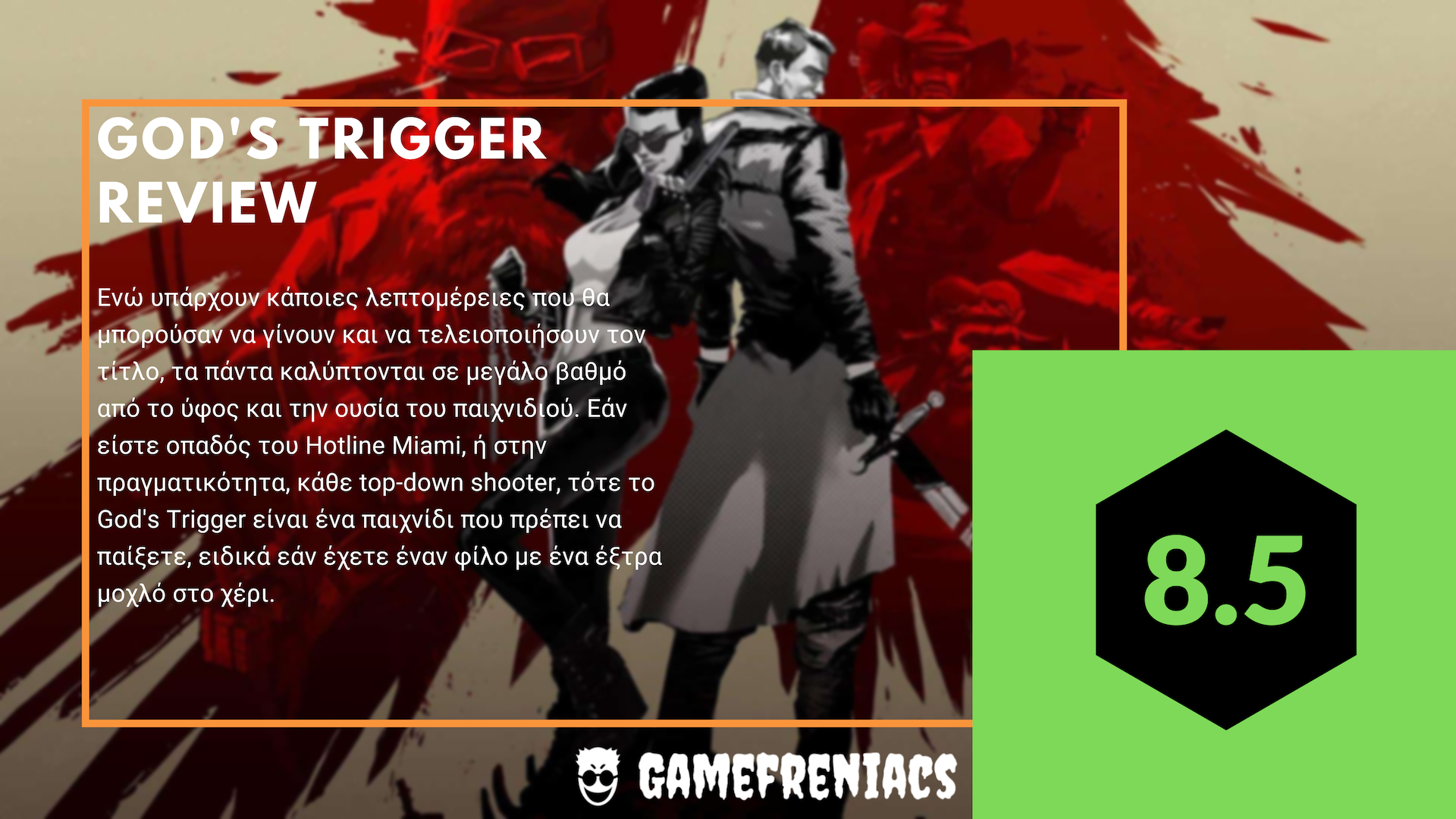 To God’s Trigger είναι ένα από τα καλύτερα top-down shooter αυτής της γενιάς. Το βάθος και η διακύμανση του παιχνιδιού, μαζί με το μηχανισμό ενός χτυπήματος-θανάτου, εξασφαλίζουν ότι η εμπειρία παραμένει συνεχώς φρέσκια και αφοσιωμένη. Το μόνο μειονέκτημα είναι ότι είναι πάρα πολύ εύκολο να παρακάμψετε ένα μεγάλο μέρος της δυσκολίας, αλλά ακόμα και τότε, η διασκέδαση παραμένει ακέραια. Εάν απολαμβάνετε τους top-down shooter τίτλους, τύπου Hotline Miami, το God’s Trigger είναι για εσάς.