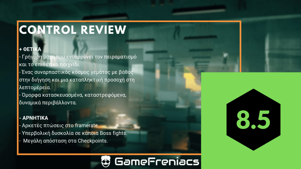 Το τσιμεντένια θεμέλια του Old House είναι αρκετά ανθεκτικά ώστε να αντέχει αυτά τα θέματα, καθώς ο Control είναι το μεγαλύτερο και καλύτερο παιχνίδι της Remedy. Η ποσότητα δεν είναι ίση με την ποιότητα, αλλά η άνοδος και των δύο είναι ένα δύσκολο έργο για τους προγραμματιστές. Η παράξενη ιστορία και ατμόσφαιρα θα κεντρίσει το ενδιαφέρον και θα κάνει τους παίκτες να ασχοληθούν ξανά και ξανά με τον τίτλο. Η μάχη είναι δυναμική και πιο ευχάριστη από κάθε άλλο τίτλο της Remedy. Ενώ γίνεται ακόμη περισσότερο διασκεδαστική όταν συνδυάζετε διαφορετικές ικανότητες και ανεβάζετε το pacing προχωρώντας στο παιχνίδι. Από την αφήγησή του, στον κόσμο του, μέχρι τα παζλ και τις μάχες του, Το Control ιντριγκάρει τους παίκτες του και τους καλεί να σκεφτούν και τους ανταμείβει κάθε φορά που κάνουν κάτι τέτοιο. Το Control αποτελεί μια όαση στο κυκεώνα των υπερβολικά γραμμικών και κοινότυπων σχεδιαστικά παιχνιδιών και μόνο γι αυτό αξίζει να το δοκιμάσετε.