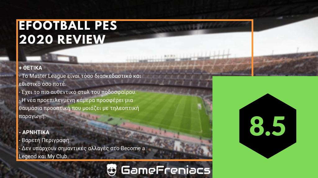 Η έλλειψη εφευρετικότητας εμφανίζεται σε μερικά σημεία – όπως το δημοφιλέστερο myClub – και είναι κρίμα, ακόμη και η Master League δεν έχει ακόμα το πλήρες πακέτο. Αλλά όταν η ποιότητα του ποδοσφαίρου εντός του αγωνιστικού χώρου είναι τόσο καλή, είναι εύκολο να συγχωρήσει κάποιος μερικές αστοχίες, με την ελπίδα ότι θα διορθωθούν του χρόνου.