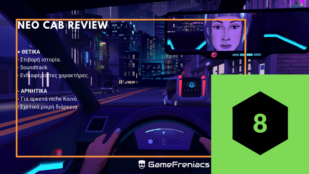 Το Neo Cab είναι ένα εξαιρετικό, αλλά αρκετά ιδιαίτερο παιχνίδι. Η έξυπνη, σφιχτή ιστορία του είναι εξαιρετική, ενώ περιλαμβάνει μερικές από τις καλύτερες αλληλεπιδράσεις χαρακτήρων της χρονιάς. Δεν είναι σίγουρα ένα παιχνίδι για όλους, αλλά όσοι έχουν υπομονή θα βρουν πολλά για να αγαπήσουν.