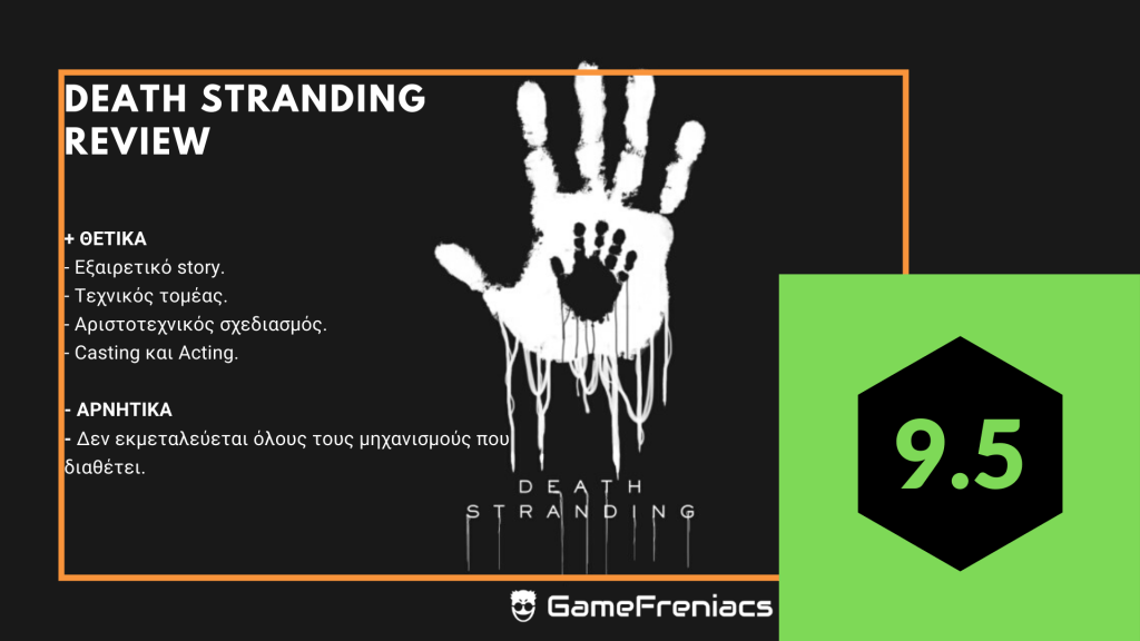 Το Death Stranding είναι ένα από τα καλύτερα παιχνίδια αυτής της γενιάς. Είναι έξυπνο, είναι φτιαγμένο με πολύ μεράκι και είναι εμπειρία να το παίζεις. Είναι επίσης κάτι φρέσκο. Δεν νομίζω ότι κάποιο άλλο παιχνίδι δίνει την επιβράβευση στον παίκτη για τις επιλογές του και την πραγματική εκπλήρωση ενός στόχου, περισσότερο από το Death Stranding. Σίγουρα, υπάρχουν πολλά παιχνίδια που το προσφέρουν ως ένα σημείο. Δεν θέλω να υποβαθμίσω το έργο κάποιου άλλου. Ωστόσο, το Death Stranding θα σας κάνει να σκεφτείτε κάποια πράγματα, ακόμα και μετά την ολοκλήρωση του παιχνιδιού.