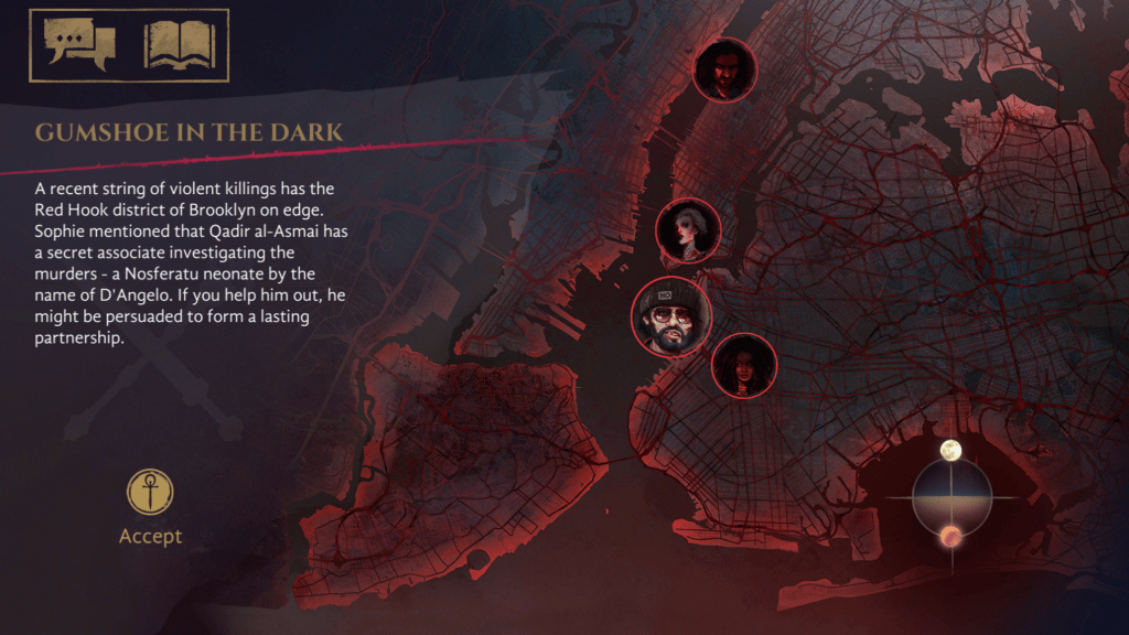 Όλοι οι πιθανοί σύντροφοί σας έχουν μια ιστορία για να ολοκληρώσουν, κάθε μία από τις οποίες είναι αναζωογονητικά μοναδική. Για παράδειγμα, ο D’Angelo σας προσλαμβάνει για να τον βοηθήσετε να πιάσετε έναν serial killer βρικόλακα, ενώ ο Malkavan Hope σχεδιάζει να διεισδύσει στην υψηλή κοινωνία με τα βίντεο φετίχ βαμπίρ. Κάθε μια από αυτές τις μίνι questlines μπορεί να πάει καλά, ή πολύ άσχημα, ανάλογα με τις επιλογές σας. Υπάρχει επίσης μια ποικιλία μικρότερων ιστοριών που δεν σχετίζονται με το coterie που μπορείτε να ακολουθήσετε – να ασχοληθείτε με έναν δημοσιογράφο, για παράδειγμα, ή να διερευνήσετε τη σχέση σας με τον Θεό τώρα που είστε ένας από τους καταραμένους. Όπως αναφέρθηκε, το παιχνίδι σας δίνει μόνο ένα περιορισμένο αριθμό διανυκτερεύσεων, οπότε θα πρέπει να επιλέξετε τι να κάνετε και με ποιον θα το κάνετε.