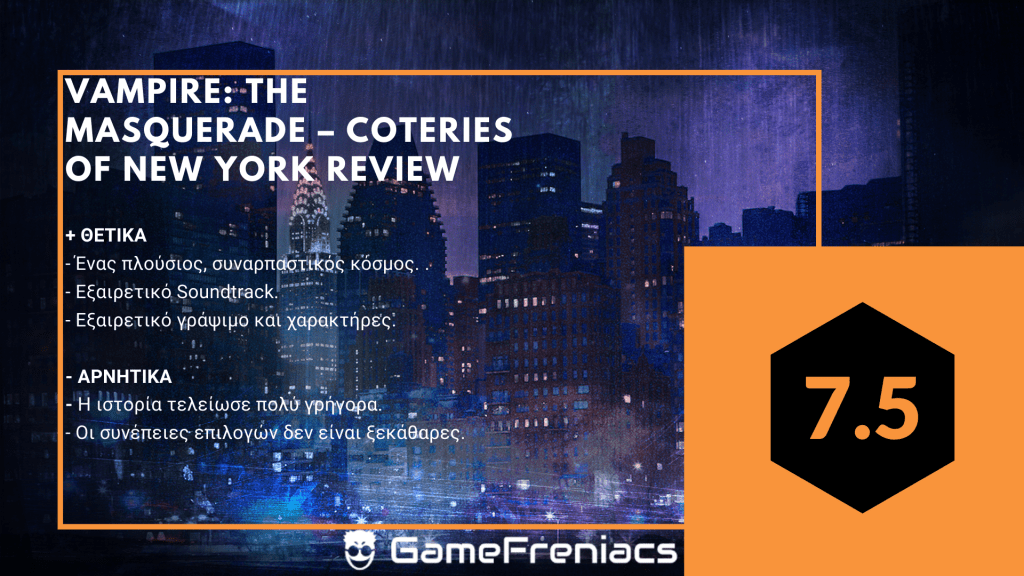 Κλείνοντας, θα λέγαμε ότι, το Vampire The Masquerade – Coteries of New York είναι ένα εξαιρετικό σημείο εισόδου και μια καλή προσαρμογή του παραδοσιακού επιτραπέζιου RPG. Αν ψάχνετε για μια γερή ιστορία βαμπίρ προτείνεται ανεπιφύλακτα για εσάς.