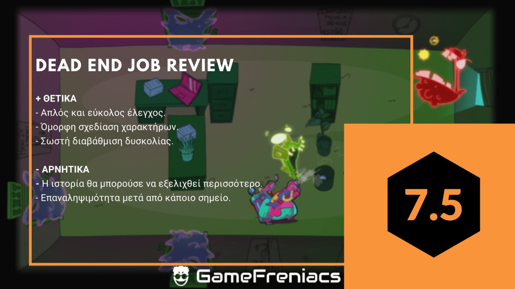 Το review έγινε στην έκδοση του PC και ήταν παροχή τoυ publisher Headup Games . Το Dead End Job είναι διαθέσιμο τώρα στο Playstation 4, Nintendo Switch, Xbox One και στο PC.