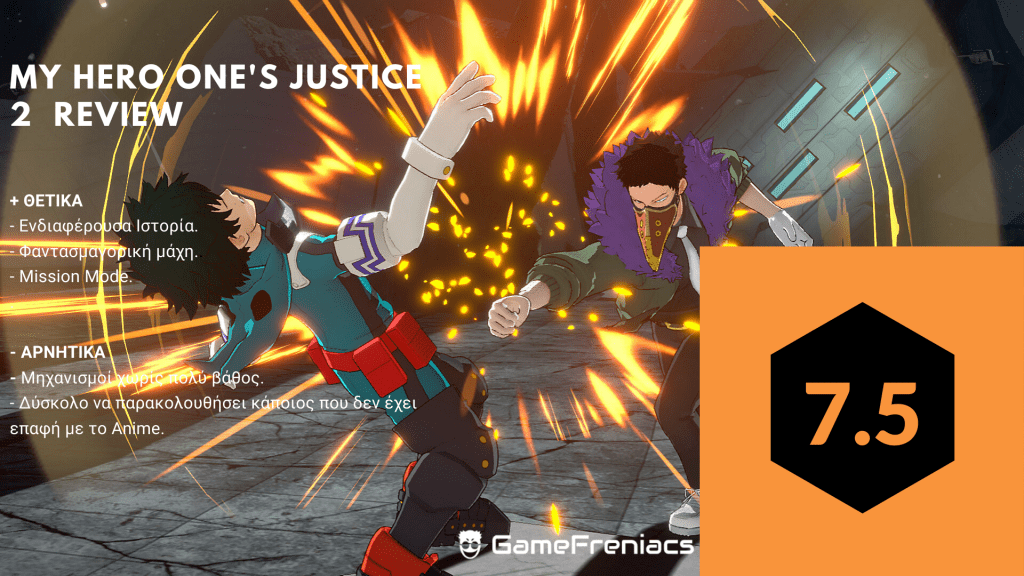 Συνολικά, το My Hero One’s Justice 2 κάνει σπουδαία δουλειά στο να μεταδώσει στους παίκτες την εμπειρία της My Hero Academia. Η ιστορία καλύπτει τα τρέχοντα γεγονότα του anime, αλλά ταυτόχρονα αποκαλύπτει και την πλευρά των κακοποιών. Η μάχη δεν είναι όσο βαθιά όσο θα θέλαμε αν και δεν πρέπει να περιμένετε κάτι τέτοιο σε ένα παιχνίδι όπως αυτό, που δίνει περισσότερο βάρος στην φανταχτερή και διασκεδαστική πτυχή των μαχών.