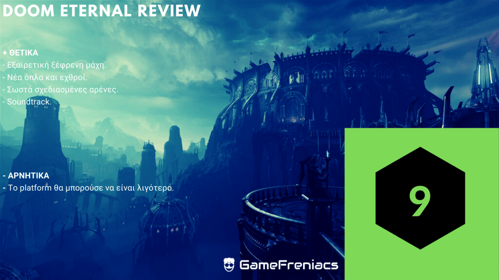 Το Doom Eternal είναι μια μεγαλύτερη και ακόμα καλύτερη έκδοση σε σχέση με τον προκάτοχο του. Ο developer αναγνωρίζοντας ακριβώς τους λόγους που οδήγησαν τους οπαδούς να αγαπήσουν αυτό το παιχνίδι τόσο πολύ, έδωσε ακόμα περισσότερα για να αγαπήσουν και τη συνέχεια. Με το Doom Eternal η Id Software έχει δημιουργήσει έναν από τα καλύτερα first-person shooter της γενιάς.