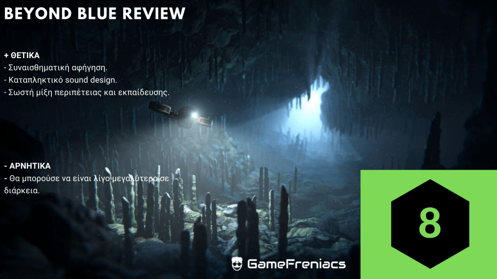 Tο review έγινε στην έκδοση του Xbox One και ήταν παροχή του publisher. Το Beyond Blue είναι διαθέσιμο τώρα στο Playstation 4, Xbox One, και στο PC.