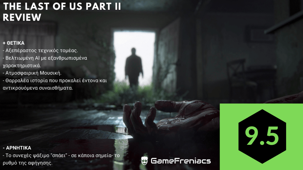 Το Last of Us Part II παρουσιάζει μια εξαιρετικά προχωρημένη και προκλητική αφήγηση για την αγάπη και το μίσος. Οι χαρακτήρες έχουν πειστικά κίνητρα που σας αφήνουν να σκεφτείτε περισσότερο για το τι διαδραματίζεται μπροστά σας. Τα μέρη που θα σας οδηγήσει είναι εκπληκτικά για να εξερευνήσετε, με ασυναγώνιστη προσοχή στη λεπτομέρεια, και παρόλο που η μάχη είναι κάπως συγχωρητική, παραμένει συναρπαστικό σε ένα μεγάλο μέρος του σκληρού ταξιδιού. Στο φινάλε το Last of Us Part II αφήνει μια βαθιά, συναισθηματική επίδραση και αυτή την αξέχαστη συνέχεια δεν πρέπει να χάσετε.