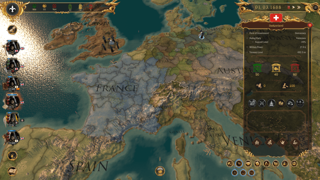 Αυτό είναι σίγουρα μια ενδιαφέρουσα αλλαγή στην κλασική προσέγγιση που βλέπουμε από την Paradox στους τίτλους grand strategy – έχετε τους γνωστούς χάρτες και τα μενού, τους χαρακτήρες σε μικρά πορτραίτα και πολλά menu που εμφανίζουν πληροφορίες για φαινόμενα όπως «αναταραχές» και «Whigs». Αλλά υπάρχει επίσης ένα είδος εικαστικού που βγάζει αυτόν τον αέρα Illuminati, όπως το έμβλημα της μασονικής στοάς και η πυξίδα, τα τελετουργικά στιλέτα και οι αναφορές στις Γνωστικές ιδέες του Διαφωτισμού.
