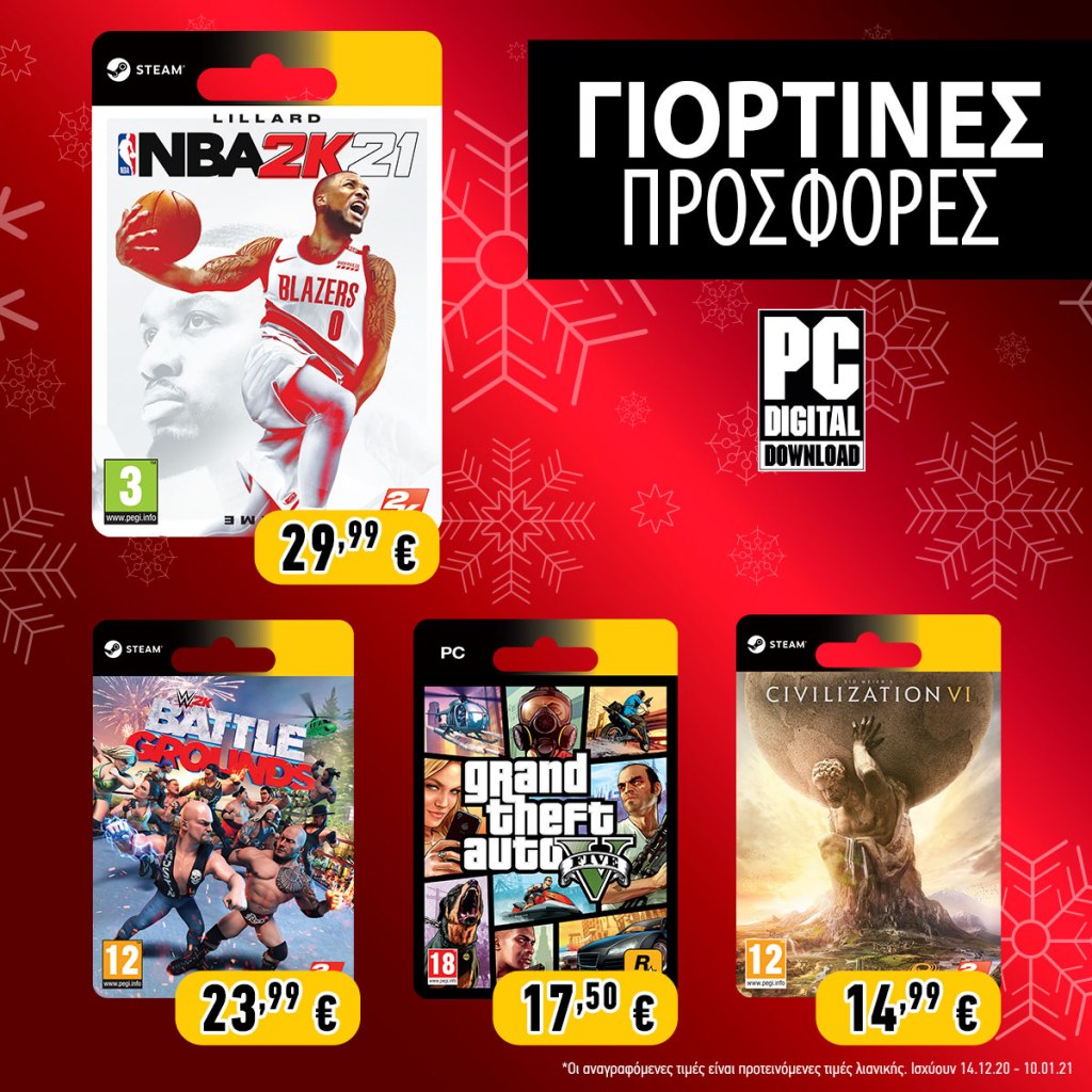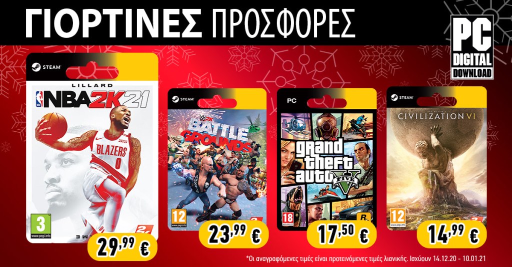 Έτσι από τις 14/12 εώς 10/01 σε όλα τα συνεργαζόμενα καταστήματα λιανικής θα μπορείτε να προμηθευτείτε σε μειωμένες τιμές τίτλους όπως το GTA V, Sid Meier’s Civilization VI, NBA 2K21 και WWE 2K Battlegrounds. Περισσότερα στον πίνακα που ακολουθεί.