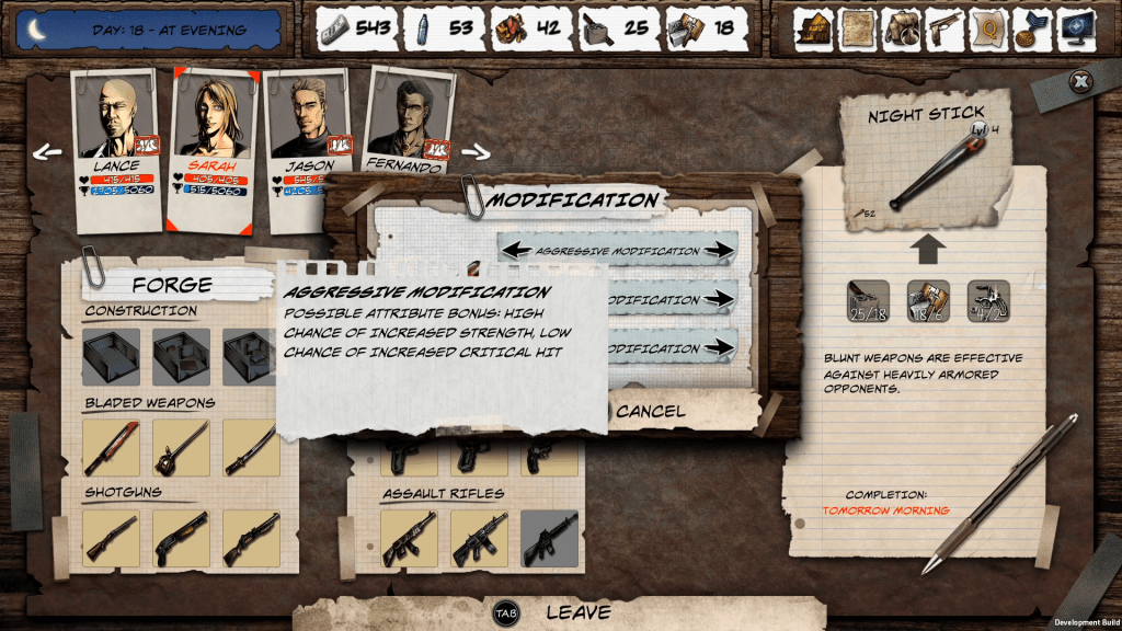 Οι πόντοι θα χρησιμοποιηθούν για την βελτίωση των στατιστικών της ομάδας σας, μπορείτε να βελτιώσετε τη ζωή των χαρακτήρων, τη δυνατότητα για melee και ranged επιθέσεις, τη φυσική και ειδική άμυνα, καθώς και τις πιθανότητες για critical χτυπήματα. Μπορείτε να αναπτύξετε την ομάδα σας όπως θέλετε, αν και μερικοί σύμμαχοι θα έρθουν με προκαθορισμένο build, μπορείτε να τοποθετήσετε τους νέους εκεί που θέλετε.