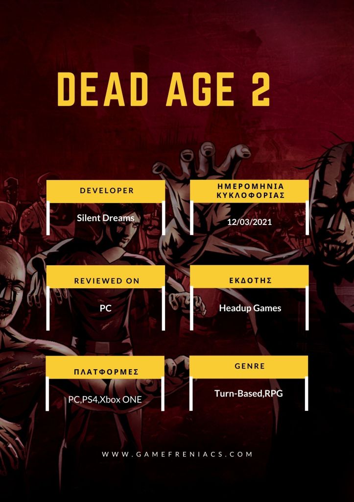Το Dead Age 2 είναι ένα πολύ ολοκληρωμένο turn-based RPG σε ένα μεταποκαλυπτικό κόσμο γεμάτο ζόμπι. Έχετε πολλές επιλογές για να επιβιώσετε, μπορείτε να προσαρμόσετε τους χαρακτήρες σας όπως θέλετε, θα δημιουργήσετε σχέσεις με άλλες ομάδες και υπάρχουν πολλά ενδιαφέροντα χαρακτηριστικά για να εξερευνήσετε. Αν είστε από αυτούς που τους αρέσουν τα παιχνίδια με ζόμπι πρέπει να το δοκιμάσετε άμεσα.