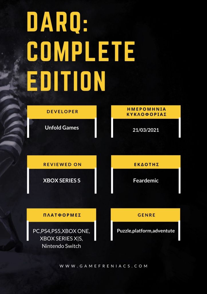 Εάν ψάχνετε για έναν νέο τίτλο τρόμου και τυχαίνει να λατρεύετε και τα παζλ, θα σας συνιστούσα να περάσετε λίγο χρόνο με το DARQ: Complete Edition. Μπορεί να είναι σχετικά σύντομο, αλλά είναι αρκετό για να σας δείξει όλα αυτά που χρειάζονται. Χρησιμοποιεί έξυπνα παζλ και μια φανταστική ατμόσφαιρα για να σας προσελκύσει και αν ψάχνετε κάτι για να σας κρατήσει ξύπνιους τη νύχτα, τότε το DARQ: Complete Edition είναι το τέλειο τονωτικό.