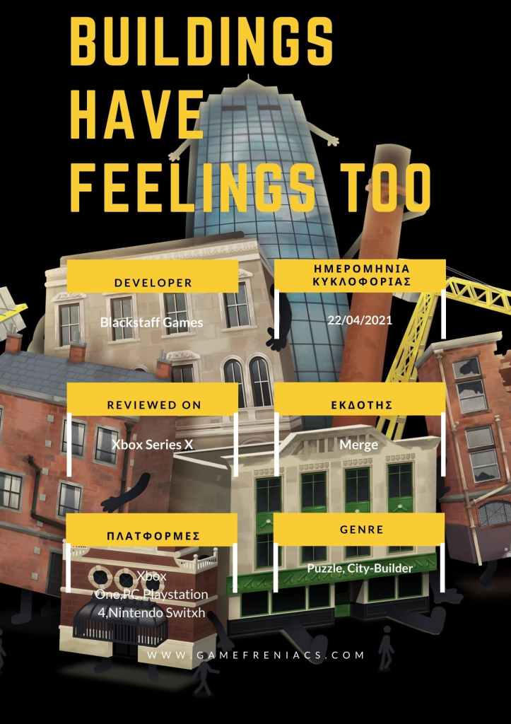 Δημιουργημένο από την Blackstaff Games και με εκδότη την Merge (publisher πίσω από τα Frostpunk, Cloudpunk και πολλά άλλα indies), το Buildings Have Feelings Too! κυκλοφόρησε για Xbox one, Playstation 4, Nintendo Switch και PC πριν μερικές μέρες. Φυσικά μπορείτε να το παίξετε και σε Playstation 5, Xbox Series X|S μέσω BC.