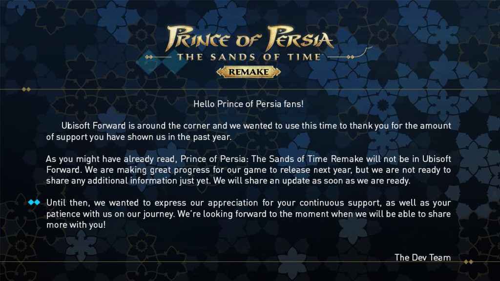 Τον Φεβρουάριο του 2021, η Ubisoft ανακοίνωσε ότι το remake του Prince of Persia: Sands of Time καθυστέρησε επ ‘αόριστο. Και χθες, ο εκδότης εξέδωσε μια ενημέρωση, δηλώνοντας ότι το παιχνίδι στοχεύει σε μια ημερομηνία κυκλοφορίας του 2022. Επιπλέον, το Prince of Persia Remake δεν θα είναι παρών στην E3 2021.