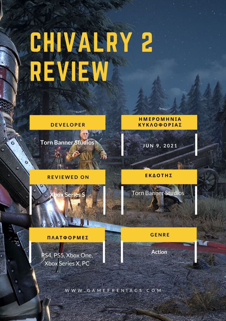 Το Chivalry 2 είναι ένας multiplayer brawl τίτλος και διάδοχος του απροσδόκητα επιτυχημένου Chivalry που κυκλοφόρησε σχεδόν δέκα χρόνια πριν. Στο Chivalry 2, δύο ομάδες έως 32 (η καθεμιά) παικτών παλεύουν μέχρι επικράτησης σε μια σειρά από άγρια ποικίλα και ευφάνταστα μεσαιωνικά πεδία μάχης. Στην επιφάνεια, υπάρχει μια ιστορία, αλλά στην πράξη, δεν θα την προσέχετε και πολύ όταν χτυπάτε ακατάπαυστα αντιπάλους με σφυριά ή αφαιρείτε ένα ή περισσότερα από τα άκρα τους.