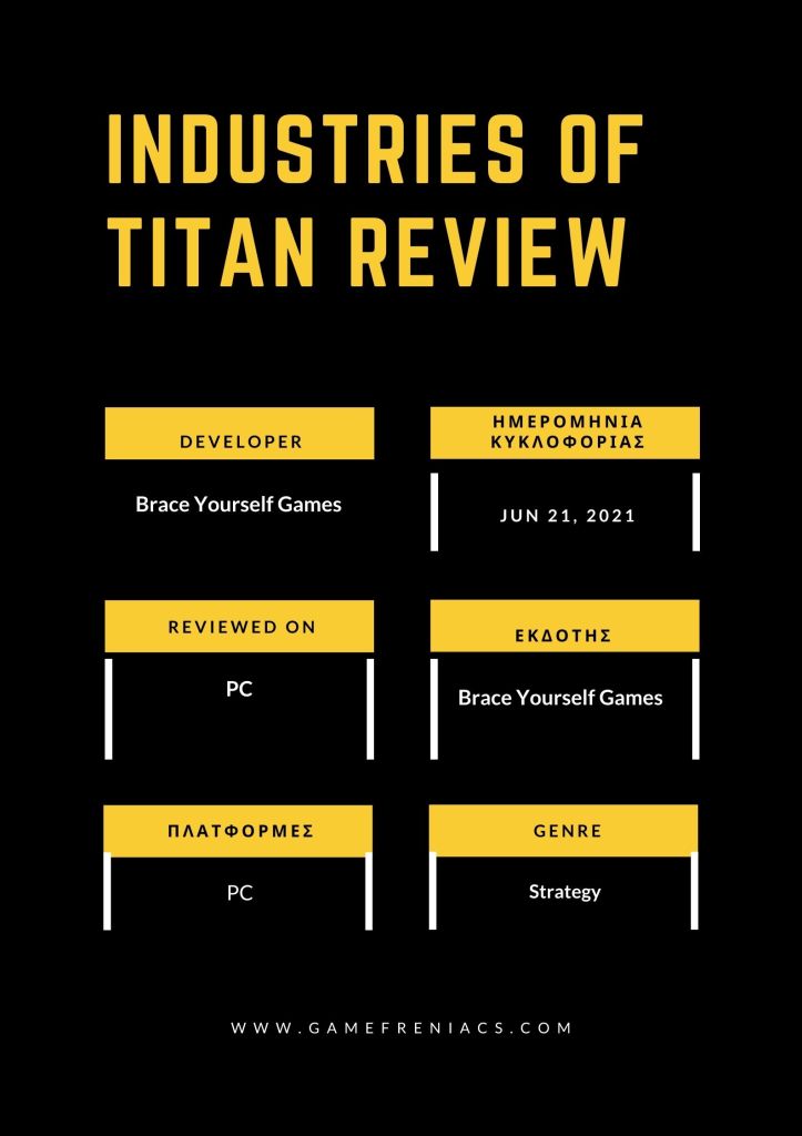 To Industries of Titan αποτελεί μια καλοδουλεμένη δουλειά με πολύ μεράκι και λεπτομέρεια από το studio Brace Yourself Games και αξίζει την προσοχή σας αν είστε φίλος των strategy games και των Sci-fi περιβαλλόντων.