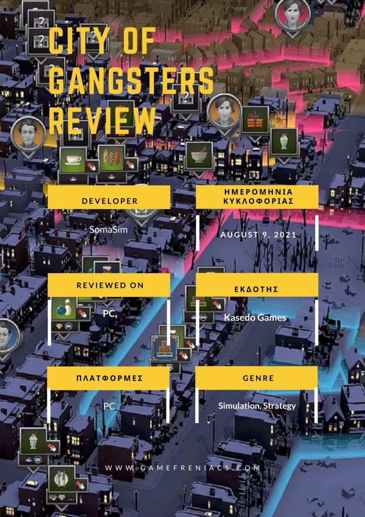 Κατά τη διάρκεια της ποτό-απαγόρευσης το 1920, οι γκάνγκστερ ήταν σε ετοιμότητα, οι αστυνομικοί ήταν σε εγρήγορσή και οι δρόμοι της Αμερικής ήταν γεμάτοι ποτά, ενώ περιουσίες δημιουργήθηκαν σε ζυθοποιίες και φούρνους πίσω από το σπίτι. Κατά καιρούς έχουν δημιουργηθεί πολλά γκάνγκστερ παιχνίδια για αυτήν την ταραγμένη περίοδο, αλλά λίγα ήταν τόσο φιλόδοξα όπως το City of Gangsters, ένα μεγάλο παιχνίδι στρατηγικής που όχι μόνο δείχνει τους γκάνγκστερ να χτυπούν κεφάλια για να φτιάξουν την αυτοκρατορία τους, αλλά και τον περίπλοκο ιστό των κοινωνικών συνδέσεων που χρειάζονται για να κρατήσουν μαζί μια εγκληματική οργάνωση.