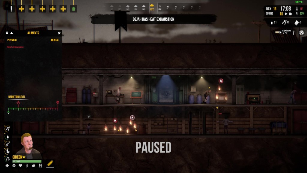 Για να το αντιμετωπίσουν αυτό, οι χαρακτήρες έχουν επίσης μια μακρά λίστα δεξιοτήτων και χαρακτηριστικών που μπορούν είτε να είναι χρήσιμες είτε να εμποδίσουν ανάλογα με την κατάσταση. Για παράδειγμα, ένας χαρακτήρας που έχει υψηλότερη βαθμολογία νοημοσύνης είναι καλύτερος στη δημιουργία αντικειμένων που απαιτούνται για την επιβίωση, ενώ ένας χαρακτήρας με γνώρισμα καλών κοινωνικών δεξιοτήτων μπορεί να χτίσει σχέσεις πιο γρήγορα. Αυτό δημιουργεί ένα σε βάθος κοινωνικό στοιχείο παρόμοιο με πιο αισιόδοξα παιχνίδια όπως το The Sims. Ωστόσο, η διαχείριση των αναγκών κάθε χαρακτήρα μπορεί γρήγορα να γίνει συντριπτική, ειδικά μεταξύ των πολλών εργασιών που απαιτούνται για να διασφαλιστεί ότι η βάση συνεχίζει να λειτουργεί.