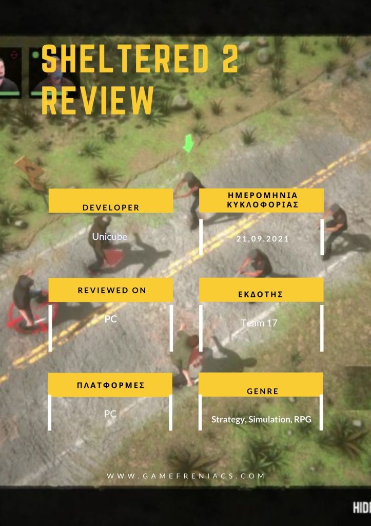 Το Sheltered 2 είναι μια εξαιρετική επιλογή για τους λάτρεις των απαιτητικών παιχνιδιών προσομοίωσης επιβίωσης ή για όσους απολαμβάνουν τους μετα-αποκαλυπτικούς τίτλους επιβίωσης με συναισθηματικό βάρος. Ο σύνθετος συνδυασμός κοινωνικών στοιχείων και αναγκών ατομικού χαρακτήρα, αναμεμειγμένος με τους μηχανισμούς του είδους επιβίωσης της εξερεύνησης, της δημιουργίας και της δημιουργίας βάσεων, δημιουργούν ένα βάναυσο περιβάλλον επιβίωσης.