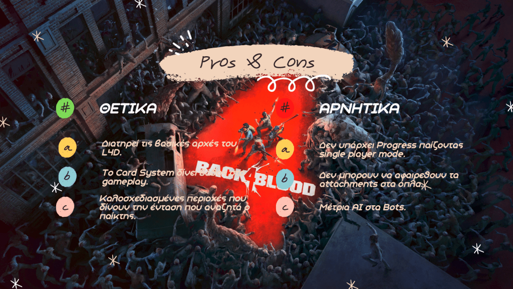 Το Back 4 Blood είναι ένας τίτλος που θα παίξω για πολύ καιρό ακόμα. Η Turtle Rock Studios έχει δεσμευτεί να βελτιώσει το παιχνίδι, τόσο μέσω νέου περιεχομένου όσο και επιδιορθώσεων. Και πιστεύω πραγματικά ότι θα διορθώσουν τα περισσότερα λάθη. Μπορεί να φαίνεται κάπως λίγο σε περιεχόμενο και θα χρειαστείτε μια ομάδα συμπαικτών αν θέλετε να κάνετε κάποια πραγματική πρόοδο, αλλά δοκιμάστε το τώρα και θα εκπλαγείτε ευχάριστα από το πόσο διασκεδαστικό μπορεί να γίνει το Back 4 Blood.