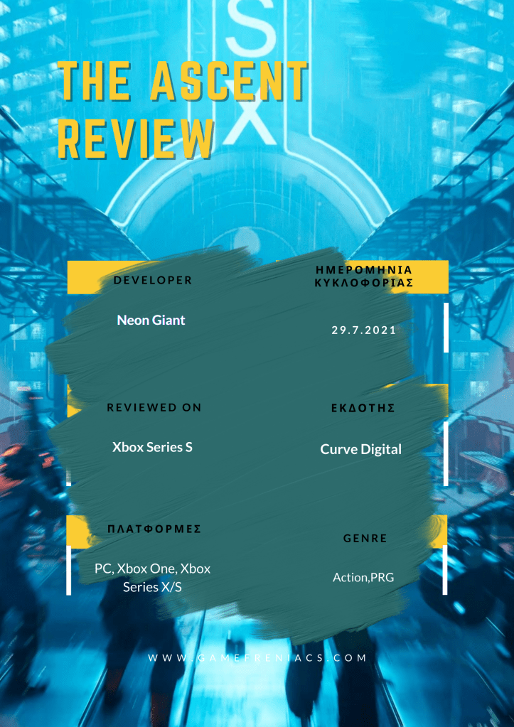 Το Neon Giant είναι ένα μικρό studio που πέρασε τα τελευταία τρία χρόνια δουλεύοντας σε ένα project που ήλπιζαν ότι θα τους πήγαινε σε ένα μεγαλύτερο επίπεδο από αυτό που μέχρις πρότινος βρισκόντουσαν. Αυτά τα χρόνια σκληρής δουλειάς είχαν ως αποτέλεσμα τη δημιουργία του The Ascent, ενός action-shooter RPG που διαδραματίζεται σε έναν cyberpunk κόσμο. Αυτή η δουλειά και η αυτοπεποίθηση έχουν αποδώσει πολλά, γιατί το The Ascent είναι μια από τις πιο μοναδικές co-op εμπειρίες που είχα φέτος.