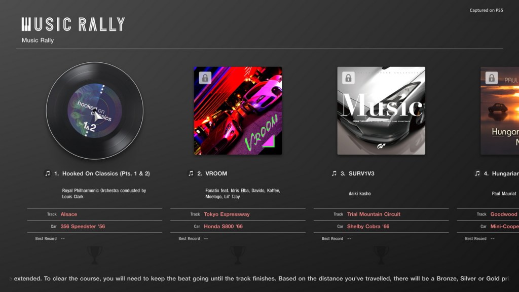 Όμως δεν θα ήταν ένα παιχνίδι Gran Turismo χωρίς κάποια τρελή νέα λειτουργία, με το νέο Music Rally να ενισχύεται για το Gran Turismo 7. Φαινομενικά μια παραλλαγή μιας παραδοσιακής λειτουργίας των checkpoints, αντί να αγωνίζεστε ενάντια στο ρολόι, αγωνίζεστε ενάντια σε αντίστροφη μέτρηση που εξαρτάται από το τραγούδι που θα επιλέξετε να οδηγείτε – σε αυτό που έχει σχεδιαστεί για να είναι μια πιο χαλαρωτική, ανοιχτή εισαγωγή στην οδήγηση για τους νεοφερμένους.