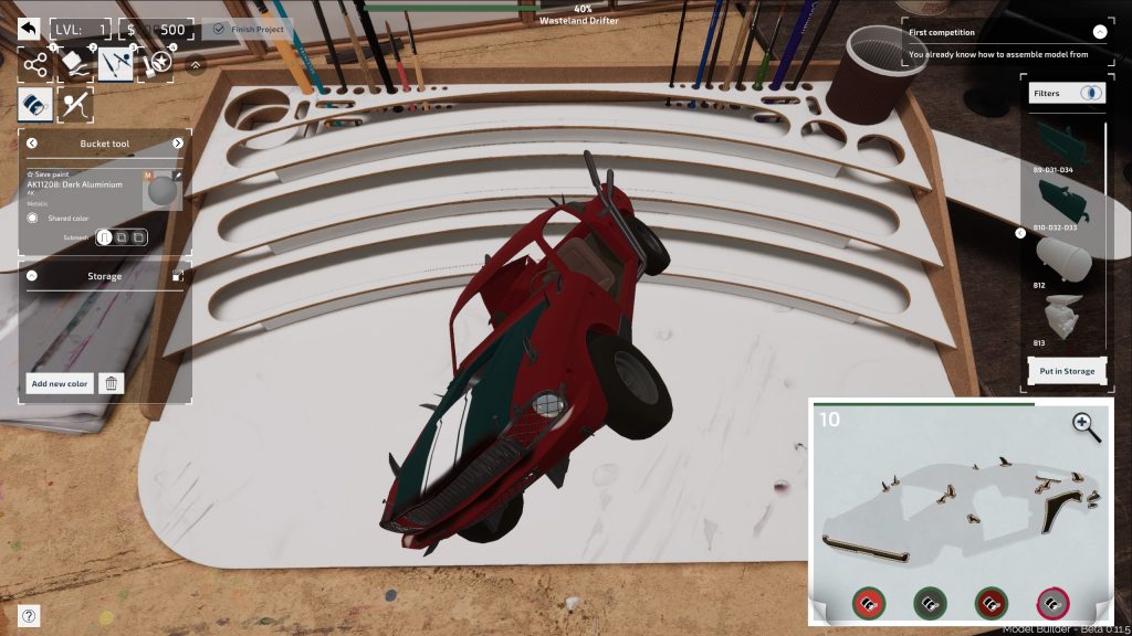 Κάνοντας κλικ στα διάφορα χρώματα βαφής στο εγχειρίδιο του μοντέλου, μπορείτε στη συνέχεια να δείτε ποια στοιχεία χρησιμοποιούν το κάθε χρώμα και στη συνέχεια να προχωρήσετε κάνοντας απλά κλικ στο γέμισμα στο σχετικό μέρος. Η πρόοδός σας στο βάψιμο του μοντέλου καταγράφεται από ένα δαχτυλίδι που γεμίζει σταθερά καθώς πλησιάζετε στο 100% για το συγκεκριμένο χρώμα. Μπορείτε επίσης να προσθέσετε στο μοντέλο σας απίθανα εφέ αγγίζοντας με το χέρι, χρησιμοποιώντας πινέλα και σπρέι πριν τελικά στερεώσετε τα απαραίτητα αυτοκόλλητα στις σωστές θέσεις.