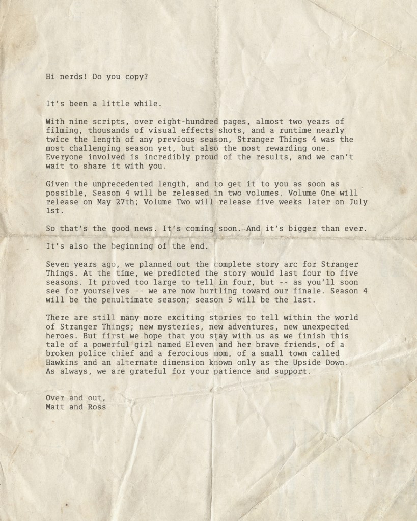 Οι Duffer Brothers επιβεβαίωσαν επίσης ότι η επόμενη σεζόν, η πέμπτη, θα είναι η τελευταία της σειράς, φέρνοντας την τρέχουσα ιστορία στο τέλος της. Ωστόσο, η επιστολή teaserare ότι «πολλές ακόμη συναρπαστικές ιστορίες για να ειπωθούν στον κόσμο των Stranger Things», που, αν μας ρωτήσετε, ακούγεται σαν μια ανοιχτή πρόσκληση για κάποιον να έρθει και να κάνει ένα spin-off show.