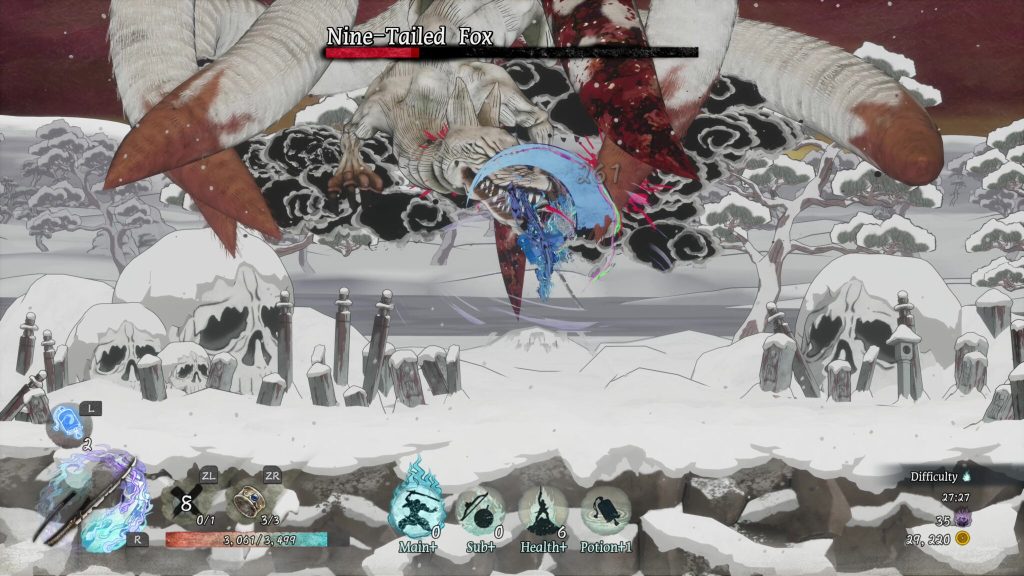 Τέλος, μου αρέσει ο τρόπος που λειτουργεί το levelling system στο GetsuFumaDen. Αντί να επιβραδύνετε το ταξίδι συγκρίνοντας σελίδες με στατιστικά στοιχεία και δέντρα δεξιοτήτων, εδώ έχετε τέσσερα εικονίδια παρατεταγμένα στο κάτω μέρος της οθόνης, που αντιπροσωπεύουν το «level» συνολικής ζημιάς που μπορούν να επιφέρουν τόσο τα κύρια όσο και με τα δευτερεύοντα όπλα, ο μετρητής υγείας και ο αριθμός των πολύ σημαντικών φίλτρων που μπορείτε να έχετε μαζί σας.