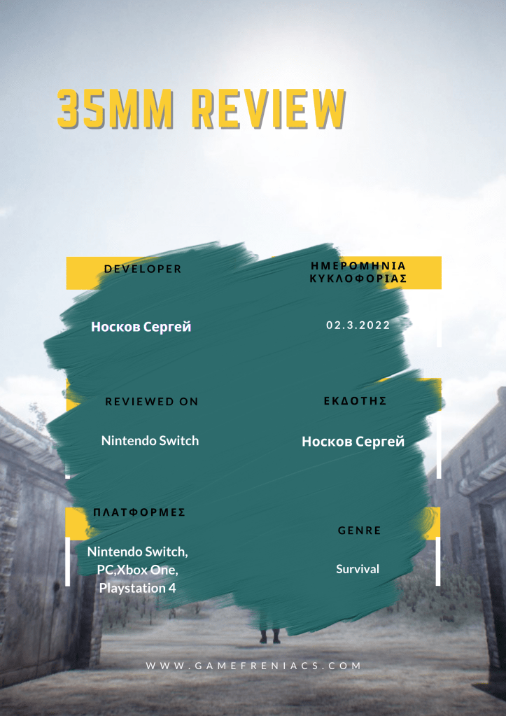 Το 35MM, είναι ένας τίτλος που αναπτύχθηκε από τον Sergey Noskov, που μας βαζει σε μια μετα-αποκαλυπτική ιστορία για δύο ταξιδιώτες που ξεκινούν την περιπέτεια τους στις ερημιές της Ρωσίας, οι οποίες έχουν αφεθεί να καταστραφούν, καθώς μια παγκόσμια πανδημία έχει κάνει την εμφάνιση της.