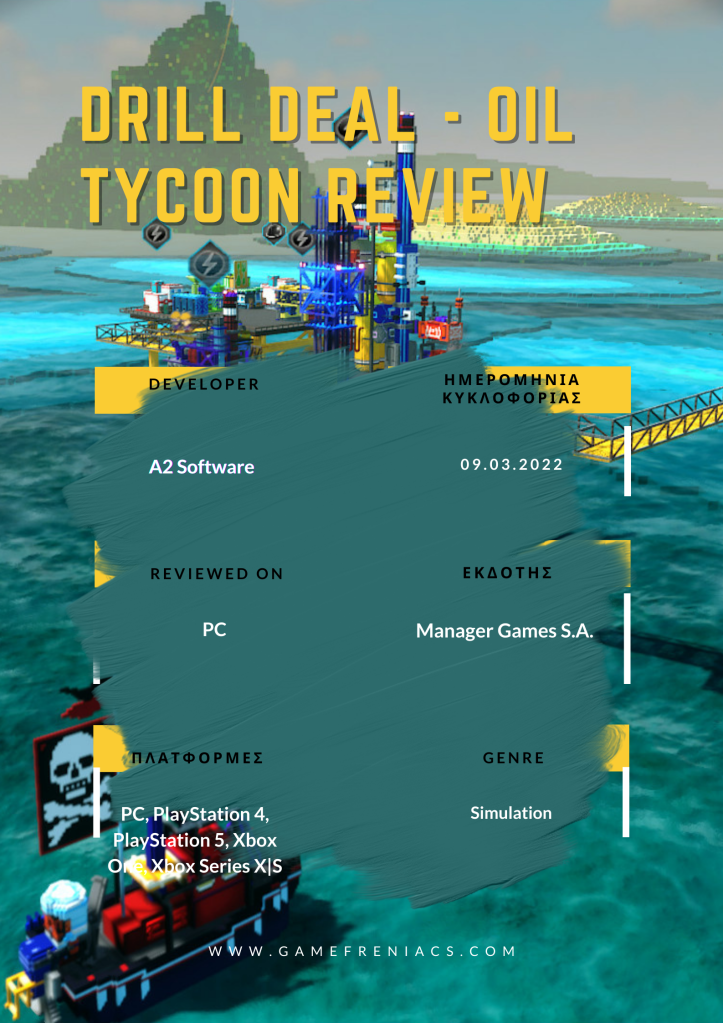To Drill Deal – Oil Tycoon είναι ένα παιχνίδι προσομοίωσης που αναπτύχθηκε από την A2 Software και έγινε published από τη Manager Games S.A.. Διαθέτει αναγνωρίσιμους μηχανισμούς, ξέφρενο gameplay και πολλαπλά τέλη, ακριβώς όπως συνηθίζεται σε αυτό το είδος των παιχνιδιών.