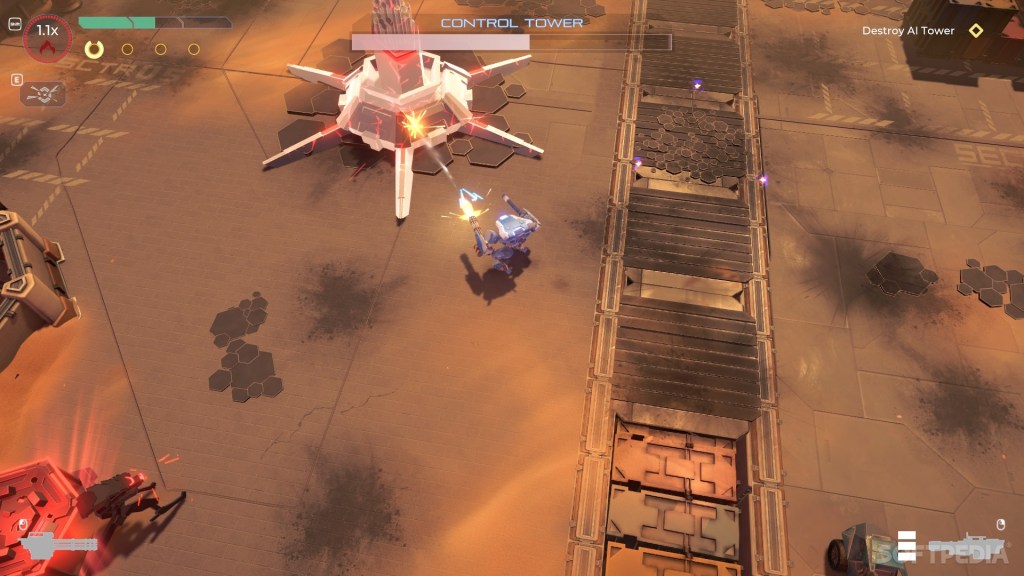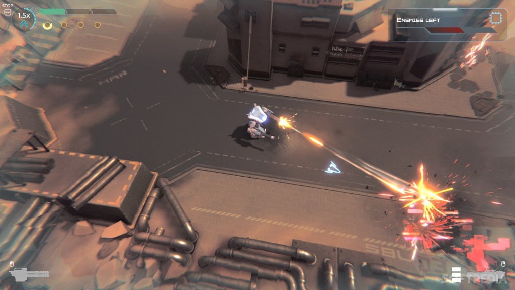 Για να γίνει αυτό, ο παίκτης πρέπει να αντιμετωπίσει εντυπωσιακές ορδές εχθρών. Κάποιοι κινούνται γρήγορα και σας αντιμετωπίζουν άμεσα, άλλοι εξαπολύουν έμμεσες επιδρομές και κάποιοι εξαπολύουν βολές από απόσταση, με ποικίλες ομάδες να παρουσιάζονται προχωρώντας στο campaign. Οι παίκτες έχουν δύο όπλα στο mech για να αντιμετωπίσουν όλες αυτές τις επιθέσεις, ένα mini-gun και έναν εκτοξευτή πυραύλων. Αφήστε τα να πυροβολούν συνεχώς και επικεντρωθείτε στην κίνηση για να αποφύγετε πιθανές ζημιές.