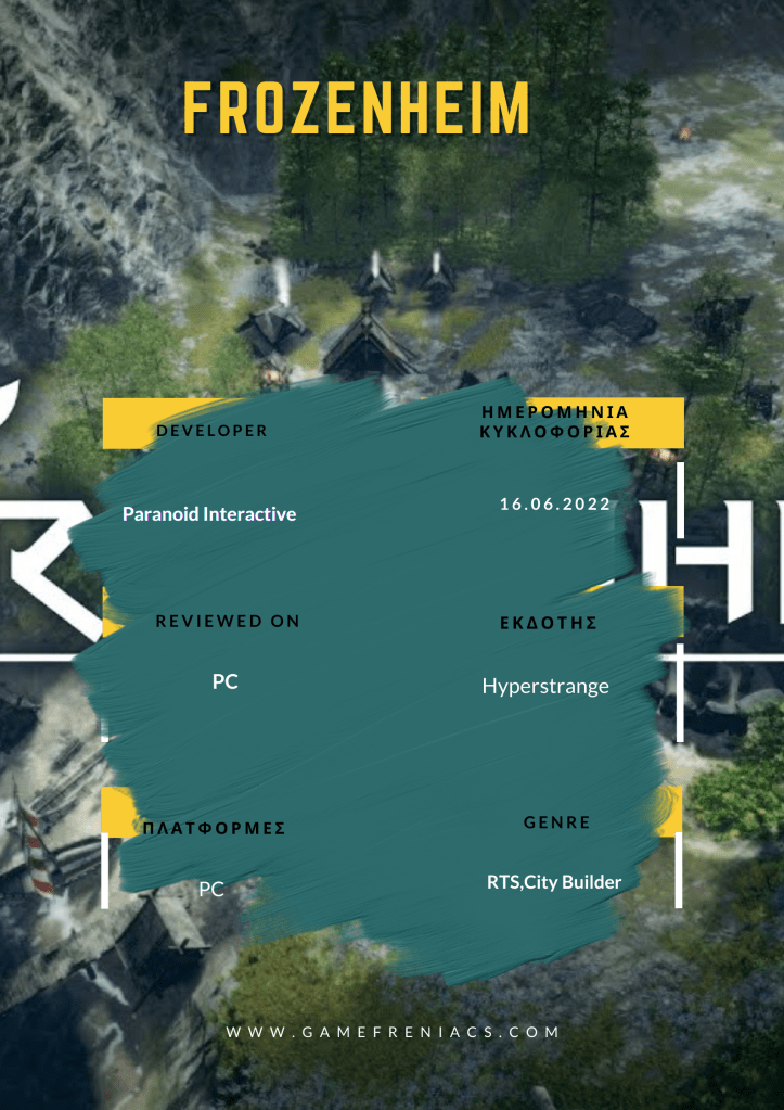 Το Frozenheim αναπτύχθηκε από την Paranoid Interactive και έγινε published από την Hyperstrange. Ο τίτλος ισχυρίζεται ότι προσφέρει έναν συνδυασμό city building στοιχείων και στρατηγικής σε πραγματικό χρόνο, σε ένα σύμπαν εμπνευσμένο από τα έπος των Βίκινγκ. Υπάρχουν τέσσερά story campaigns, με περισσότερες από 20 αποστολές για να ολοκληρώσετε.