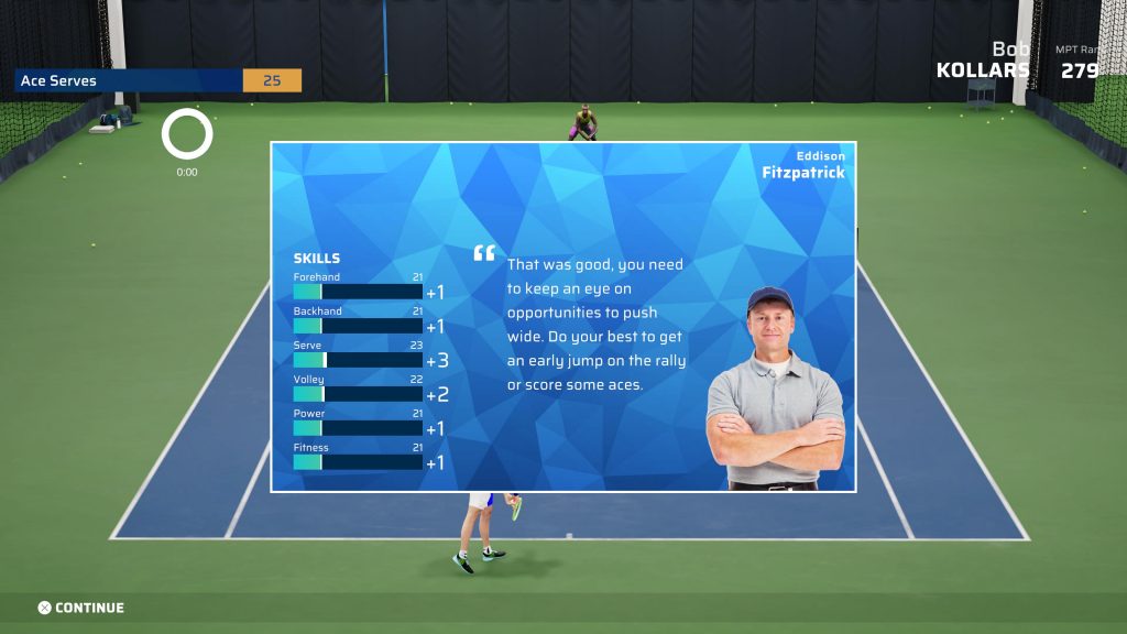 Συνολικά, είναι η απόδοσή σας στο γήπεδο που θα καθορίσει την ανάπτυξη του χαρακτήρα σας και τις ανταμοιβές του. Με τον καιρό, τα στατιστικά σας θα εξελιχθούν, επιτρέποντάς σας να ξεπεράσετε πιο σκληρούς αντιπάλους, και επιπρόσθετα, θα αποκτήσετε νέο εξοπλισμό – συγκεκριμένα ρακέτες και παπούτσια – που θα ενισχύσουν τις ικανότητές σας στο γήπεδο. Γίνετε αρκετά καλοί και θα είστε σε θέση να αντιμετωπίσετε τα πιο δύσκολα τουρνουά και πρωταθλήματα. Εκεί θα κάνετε πραγματικά όνομα.