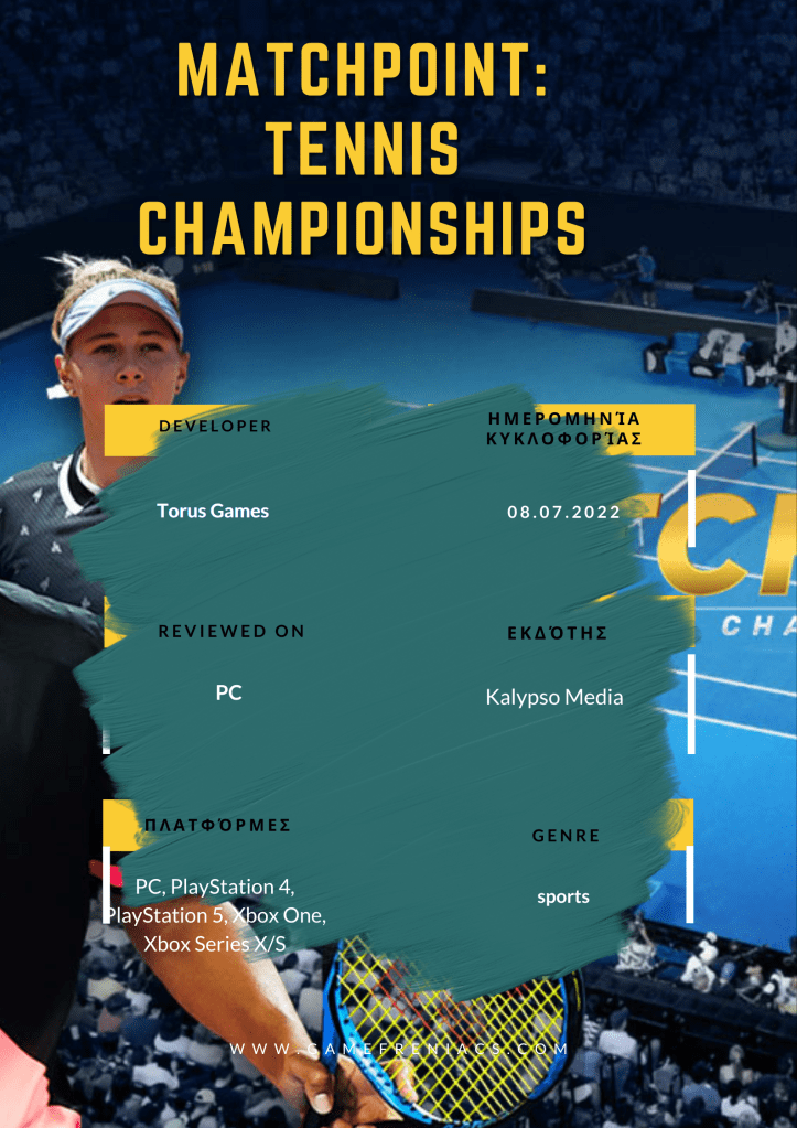 Έχοντας αναπτυχθεί από την Torus Games και έχει γίνει διανομή από την Kalypso Media, το Matchpoint: Tennis Championships στοχεύει να προσφέρει μια ρεαλιστική εμπειρία τένις. Μεταβείτε στη λειτουργία καριέρας και αφού δημιουργήσετε τον χαρακτήρα σας, εξαρτάται από εσάς πώς θα πετύχετε τον στόχο σας να γίνετε ο νούμερο ένα στον κόσμο. Αυτό σημαίνει ότι κάθε εβδομάδα θα έχετε σημαντικές αποφάσεις να πάρετε για τις δραστηριότητές σας.