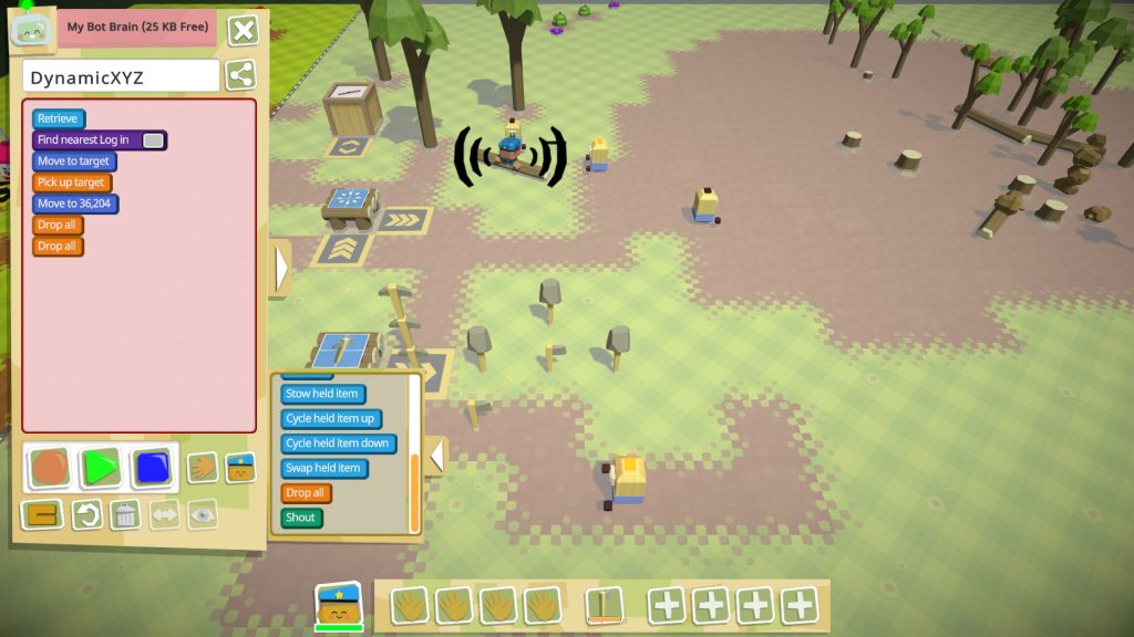 Η βασική ιδέα είναι να δώσεις εντολή στους χαρακτήρες να καθαρίσουν, να δημιουργήσουν και να αυτοματοποιήσουν τη διαδρομή τους σε κάθε επίπεδο, χρησιμοποιώντας workbots για να κάνουν τα πράγματα αποτελεσματικά. Διαφορετικοί πόροι μπορούν να χρησιμοποιηθούν ως εξαρτήματα ή/και εργαλεία. Για παράδειγμα, τα κουκούτσια μπορούν να χρησιμοποιηθούν ως βασικά εργαλεία κοπής, ενώ τα ραβδιά μπορούν να χρησιμοποιηθούν για να ξεφλουδίσουν θάμνους για φρούτα ή να σκάψουν τρύπες. Και οι δύο αυτοί πόροι μπορούν επίσης να χρησιμοποιηθούν ως εξαρτήματα σε μεγαλύτερες δομές ή εργαλεία. Ξεκινά από αρκετά περίπλοκο, αλλά μόλις το καταλάβετε, το παιχνίδι ανοίγει πραγματικά.