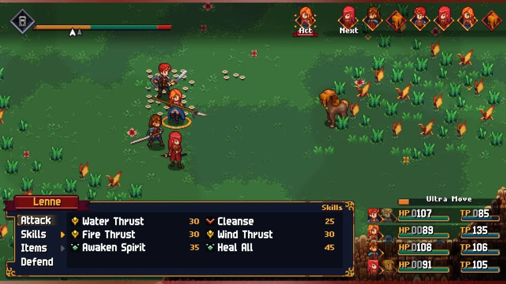 Ωστόσο, εάν κάνετε υπερβολική ζημιά ή προκαλέσετε πολύ μεγάλη ζημιά πολύ γρήγορα, μπορείτε να μεταβείτε στην κόκκινη πλευρά της ράβδου. Μόλις μπείτε στο κόκκινο, όλα αυτά τα προνόμια εξαφανίζονται. Παίρνετε περισσότερη ζημιά και προκαλείτε λιγότερη. Ο μόνος τρόπος για να βγείτε από αυτή την κατάσταση είναι να επιλέξετε τις δεξιότητες και τις κινήσεις που σας λέει το παιχνίδι να επιλέξετε. Μπορείτε επίσης να κάνετε πράγματα όπως να αλλάξετε χαρακτήρες ή να υπερασπιστείτε τον εαυτό σας. Αυτή είναι μια μεγάλη παραλλαγή σε σχέση με το συνηθισμένο σύστημα turn-based που θα βρείτε συνήθως και δείχνει ότι το Chained Echoes είναι πρόθυμο να δοκιμάσει κάποια νέα πράγματα, αν και παρόμοια συστήματα έχουν γίνει στο παρελθόν.