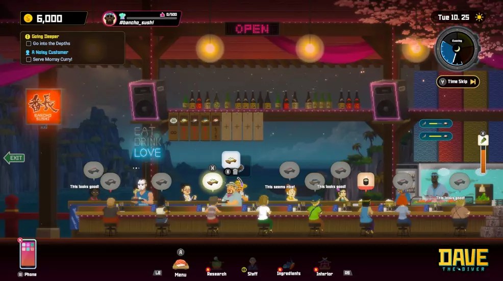 Η μετάβαση από την υποβρύχια εξερεύνηση στη διαχείριση του εστιατορίου sushi δημιουργεί μια δυναμική εμπειρία παιχνιδιού. Οι παίκτες βρίσκονται σε μια τρέλα για να κρατήσουν τους πελάτες ικανοποιημένους, παρασκευάζοντας τις παραγγελίες άμεσα και αποτελεσματικά. Καθώς το εστιατόριο κερδίζει δημοτικότητα, έρχονται περισσότεροι πελάτες, αυξάνοντας το φόρτο εργασίας για τον Dave. Η πρόσληψη πρόσθετου προσωπικού γίνεται αναγκαία για να αντιμετωπιστεί η ζωηρή ζήτηση.