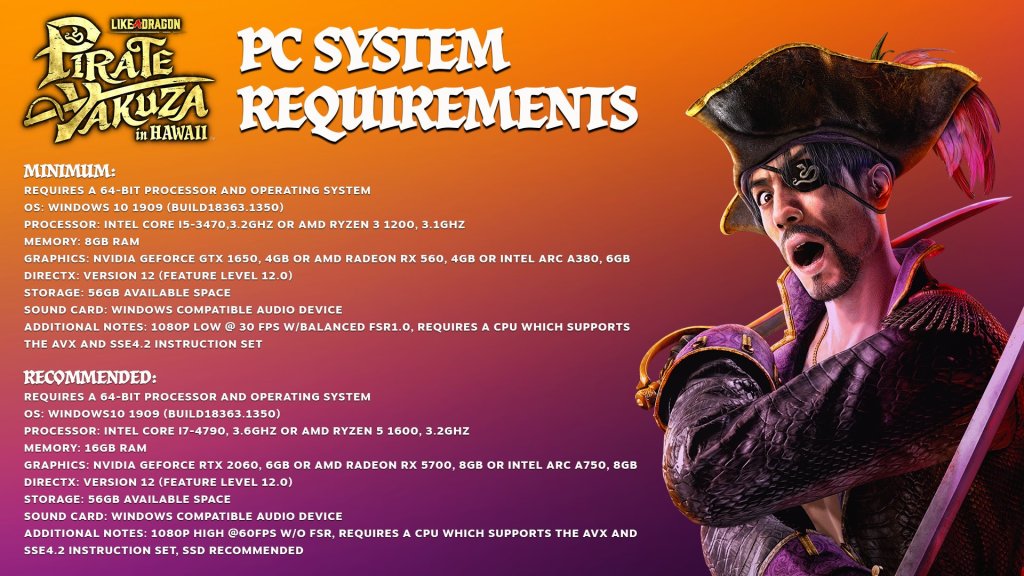 Η Sega και η RGG Studio αποκάλυψαν τις ενημερωμένες απαιτήσεις συστήματος για PC για τον επερχόμενο τίτλο τους, Like a Dragon: Pirate Yakuza in Hawaii. Αυτές οι αναθεωρημένες προδιαγραφές, που είναι πλέον διαθέσιμες στη σελίδα του παιχνιδιού στο Steam, προσφέρουν μια πιο ξεκάθαρη εικόνα του τι μπορούν να περιμένουν οι παίκτες όταν κυκλοφορήσει το παιχνίδι. Παράλληλα με την ενημέρωση των απαιτήσεων PC, η Sega επιβεβαίωσε επίσης ότι το Pirate Yakuza in Hawaii είναι Steam Deck Verified.