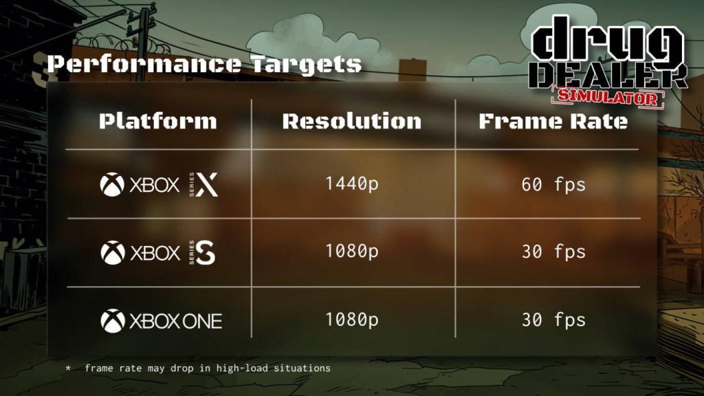 Το Drug Dealer Simulator σκιαγραφεί μια ζοφερή εικόνα μιας φανταστικής μητρόπολης που βρίσκεται στο χείλος της κατάρρευσης. Θα λέγαμε ότι θυμίζει αρκετά την Βαλτιμόρη όπως αυτή έχει σκιαγραφηθεί στις δημοφιλής σειρές των 90s και 00s, Homocide Life on Street, The Corner και το πιο γνωστό The Wire. Οι ετοιμόρροπες υποδομές, οι πανταχού παρούσες τοιχογραφίες γκραφίτι και η διαρκής απειλή της αστυνομικής επιτήρησης θέτουν το σκηνικό για έναν κόσμο όπου η επιβίωση συχνά σημαίνει λειτουργία εκτός του νόμου. Από τη στιγμή που θα μπείτε στα φθαρμένα παπούτσια ενός αρχάριου εμπόρου, το περιβάλλον είναι αυθεντικά παρακμιακό. Το Xbox, αν και δεν προσφέρει μια οπτική αναβάθμιση, εξασφαλίζει σταθερό ρυθμό καρέ και ομαλότερες μεταβάσεις καθώς περιηγείστε σε αυτή την αστική παρακμή. Ενώ οι υφές μπορεί να υστερούν σε λεπτομέρεια υψηλής ανάλυσης και οι κινούμενες εικόνες των χαρακτήρων να φαίνονται άκαμπτες, ο ατμοσφαιρικός σχεδιασμός ήχου – το μακρινό ουρλιαχτό των σειρήνων, αποσπάσματα ραδιοφωνικών εκπομπών της γειτονιάς και ο γενικός θόρυβος μιας πόλης στα όριά της – λειτουργεί αποτελεσματικά για να σας βυθίσει στη ζοφερή πραγματικότητά της.
