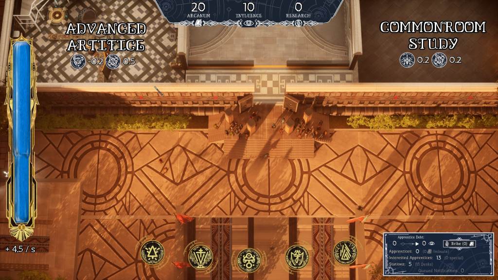 Η διαχείριση των μαθητευόμενών σας είναι το κλειδί για την επιτυχία. Κάθε χαρακτήρας έρχεται με μοναδικά χαρακτηριστικά και ικανότητες. Η ανάθεσή τους σε κατάλληλα ερευνητικά τραπέζια και δωμάτια μπορεί να αυξήσει σημαντικά την παραγωγή Arcanum. Ωστόσο, η εξισορρόπηση των φιλοδοξιών, της κόπωσης και των ικανοτήτων τους απαιτεί προσεκτική παρατήρηση και έξυπνη τοποθέτηση.