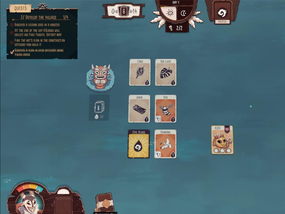 Στον πυρήνα του Kaya’s Prophecy βρίσκεται ένα συναρπαστικό σύστημα εξέλιξης πόρων. Ξεκινάτε το παιχνίδι μετριοπαθώς—με ένα μόνο μέλος της φυλής και μια χούφτα βασικούς πόρους. Ωστόσο, μέσω των booster packs, οι παίκτες μπορούν να ξεκλειδώσουν μια ποικιλία υλικών όπως άργιλο, καρύδες, πέτρα και άλλα στοιχεία κρίσιμα για την επιβίωση. Αυτοί οι βασικοί πόροι μπορούν στη συνέχεια να συνδυαστούν και να κατασκευαστούν σε πιο ισχυρά συστατικά χρησιμοποιώντας ανακαλυφθείσες «οράσεις», οι οποίες λειτουργούν ως σχέδια κατασκευής. Αυτό το σύστημα δημιουργεί μια αίσθηση προόδου και βάθους, ενθαρρύνοντας τους παίκτες να πειραματιστούν και να βελτιστοποιήσουν τη στρατηγική τους για την οικοδόμηση του χωριού. Καθώς οι παίκτες προχωρούν, αποκτούν τα εργαλεία για να κατασκευάσουν μια ακμάζουσα κοινότητα, ανοίγοντας την πόρτα σε πιο περίπλοκο σχεδιασμό και αποδοτικότητα. Δεν πρόκειται απλώς για την αύξηση των πόρων—πρόκειται για τη συσσώρευση πολυπλοκότητας με τρόπο που ανταμείβει το στοχαστικό παιχνίδι.
