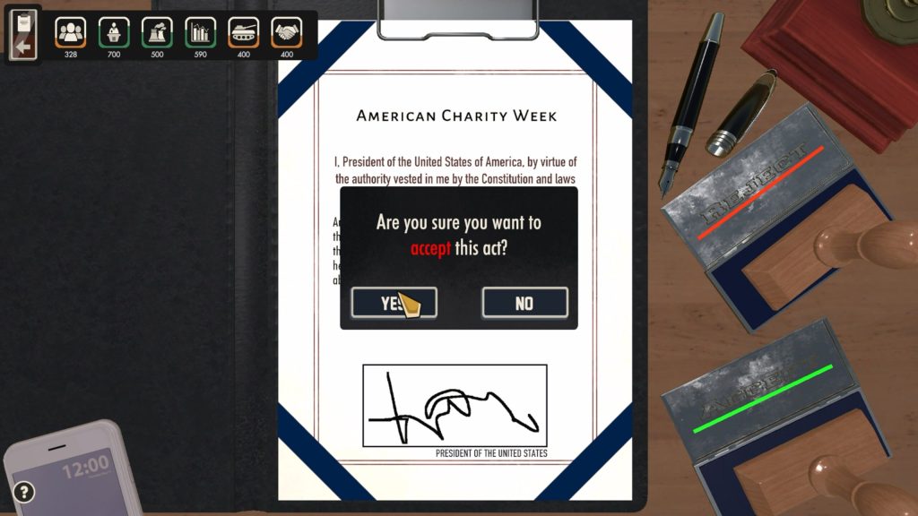 Πέρα από την καθημερινή διαχείριση κρίσεων, το «I Am Your President» προσφέρει ισχυρά εργαλεία για τη διαμόρφωση του μέλλοντος του έθνους μέσω της χάραξης πολιτικής και της εσωτερικής διαχείρισης. Θα λαμβάνετε τακτικά προτεινόμενη νομοθεσία μέσω email, ορισμένες σαφώς επωφελείς, άλλες φορτωμένες με διαμάχες. Η απόφαση ποιων νομοσχεδίων θα εγκρίνετε ή θα απορρίψετε αποτελεί βασικό μέρος της προεδρικής σας κληρονομιάς, επιτρέποντάς σας να υποστηρίζετε οτιδήποτε, από πρωτοβουλίες κοινωνικής πρόνοιας έως δυνητικά αμφιλεγόμενα προγράμματα υποχρεωτικής άσκησης.
