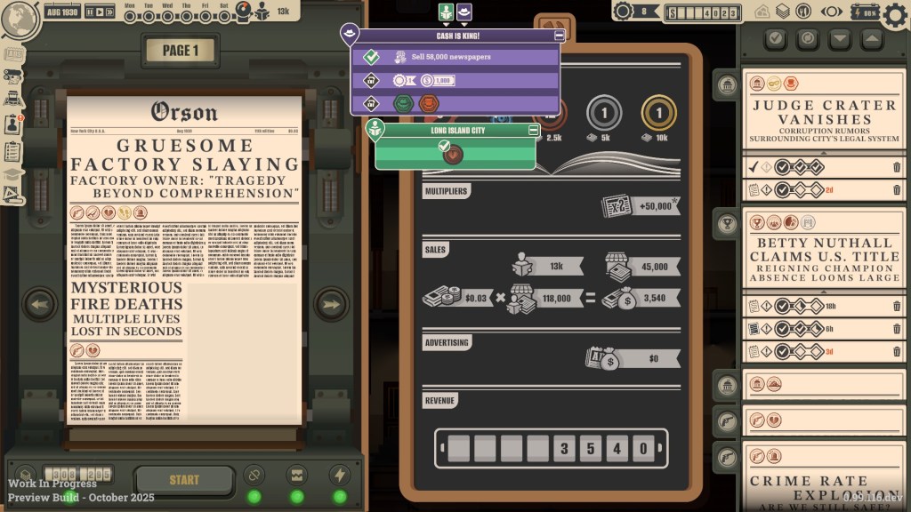 Μετά τη συλλογή των δεδομένων, οι ιστορίες περνούν από δακτυλογραφικά, editing και assembly stations. Εκεί το News Tower θυμίζει factory sim τύπου Big Pharma ή Automachef, αλλά με ρετρό δημοσιογραφική πινελιά.
