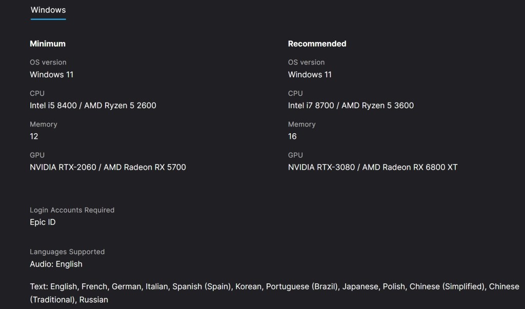 Οι προδιαγραφές υποδηλώνουν μια απαιτητική εμπειρία, κάτι αναμενόμενο για τίτλους υψηλών προδιαγραφών που χρησιμοποιούν την UE5.
